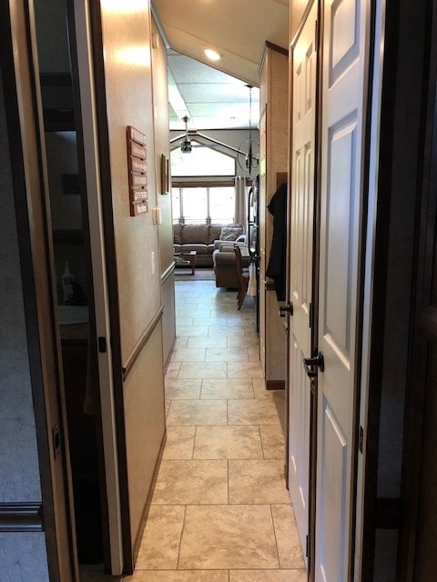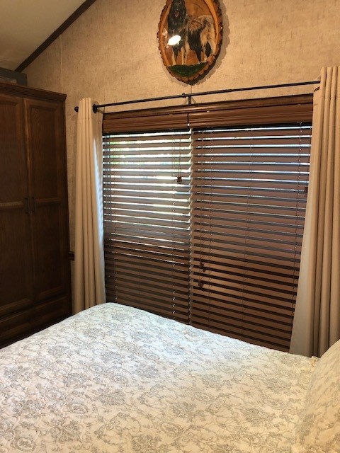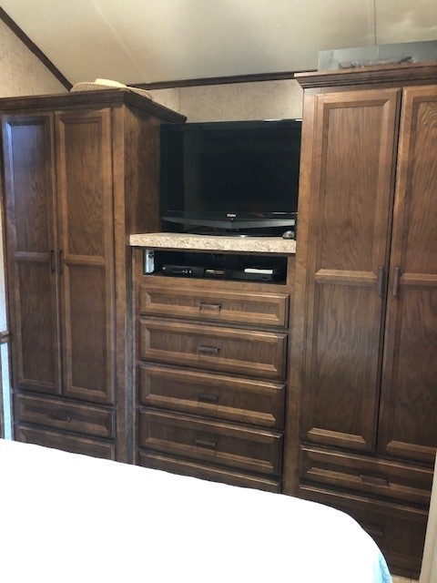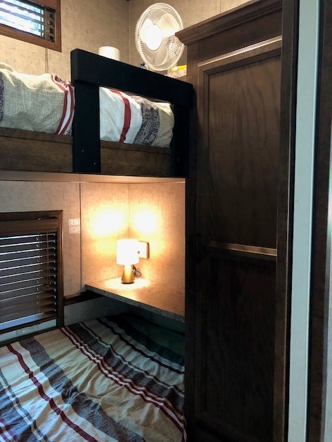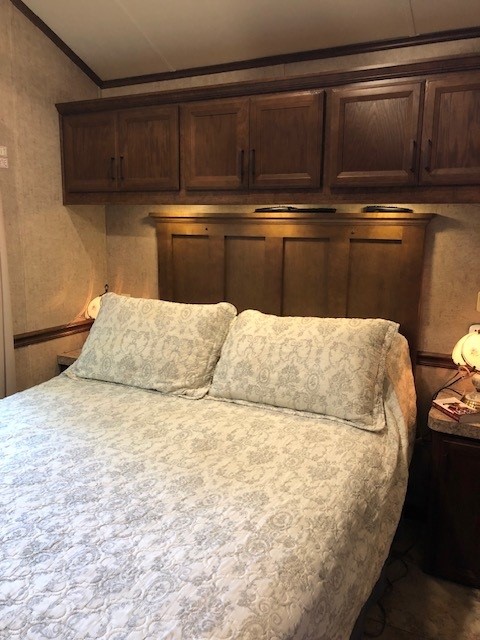 Rear primary bedroom with queen bed (storage underneath), overhead cabinets, and double wardrobes.