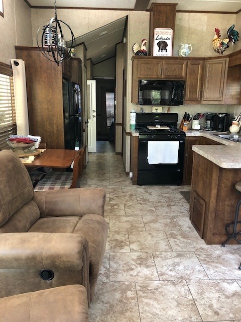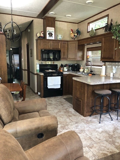 Mid kitchen with 2-seat peninsula and dining table with 4 chairs.
