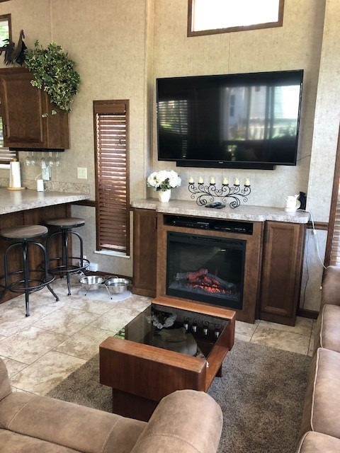 Front living room with fireplace and upgraded Ashley pull-out couch with queen memory foam mattress.