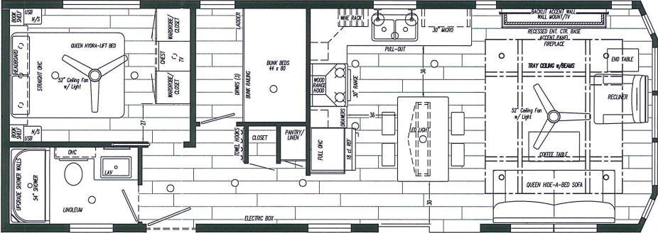 - 14′ wide front living space with beautiful backlit entertainment center finished with wood mantle